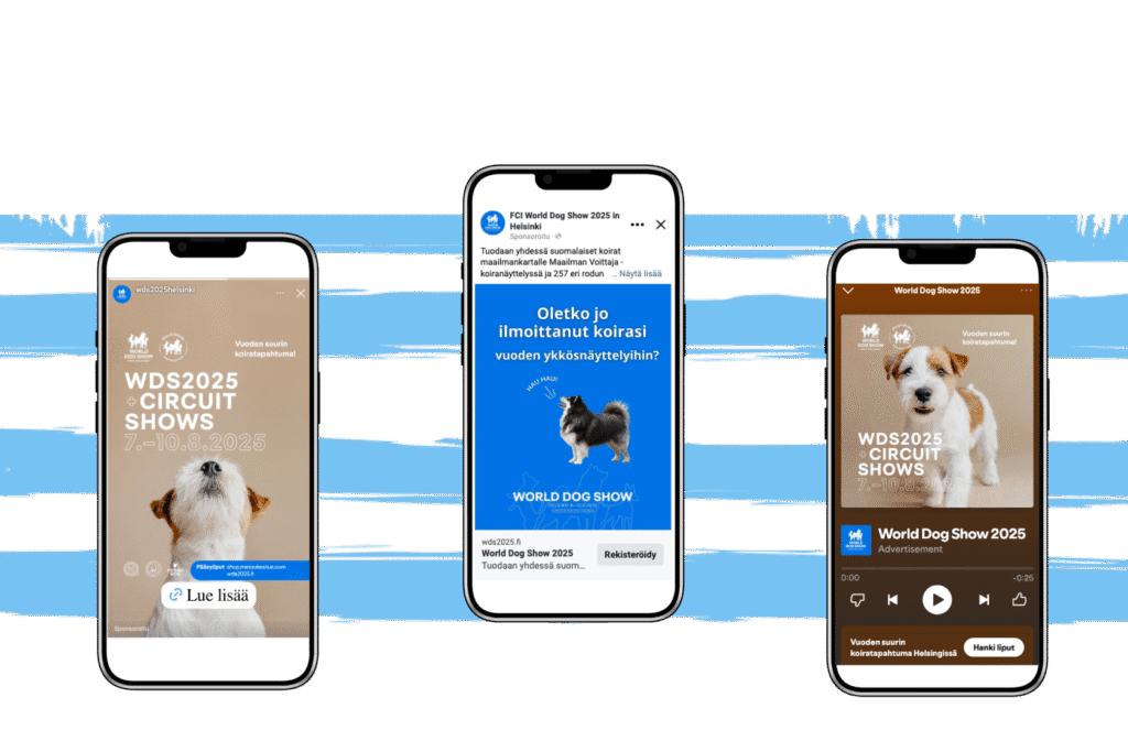 - Facebook & Instagram: eri mainosmuotoja yhdistelemällä saatiin tehokkaasti viestittyä tapahtumasta, sekä esimerkiksi Instagramin muistutusmainoksia hyödyntämällä tuotua näytteilleasettajille mahdollisuus tilata itselleen muistutus näyttelyyn ilmoittautumisen ajankohdista. Metan kanavien kautta tehtiin lisäksi hyperlokaalia mainontaa muiden koiranäyttelyiden ympärillä houkuttelemaan aiheesta kiinnostunutta yleisöä.